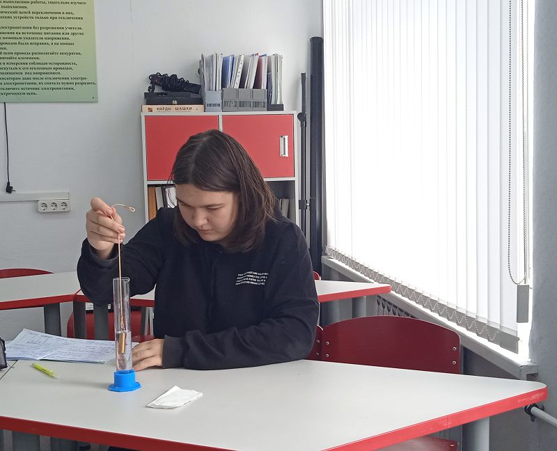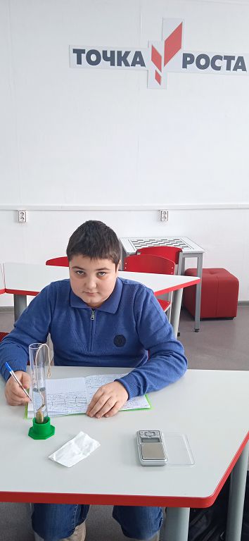 На базе центра естественнонаучной и технологической направленности «Точка роста», во время занятия по внеурочной деятельности семиклассники выполнили лабораторную работу «Измерение объема тела», в результате которой научились определять объем тел неправильной формы с помощью измерительного цилиндра (мензурки).