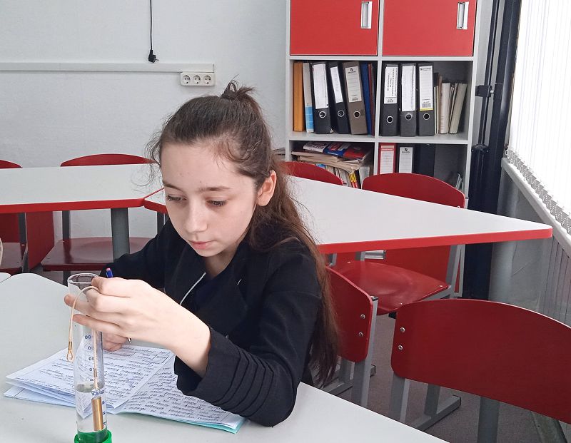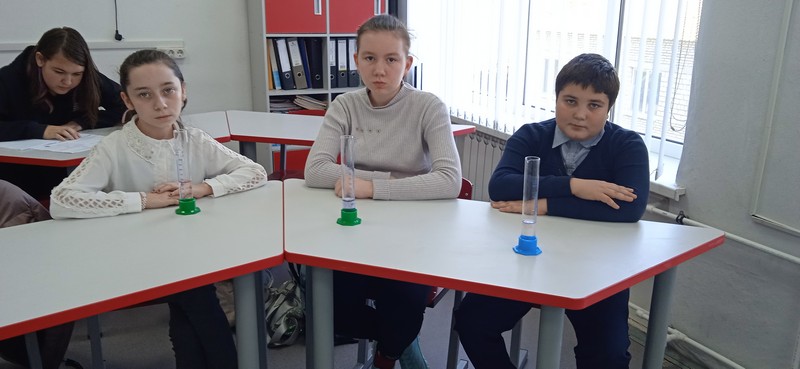 На базе центра естественнонаучной и технологической направленности «Точка роста», во время занятия по внеурочной деятельности семиклассники выполнили лабораторную работу «Измерение объема тела», в результате которой научились определять объем тел неправильной формы с помощью измерительного цилиндра (мензурки).