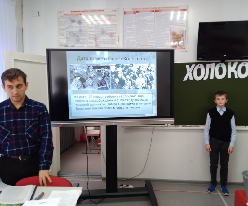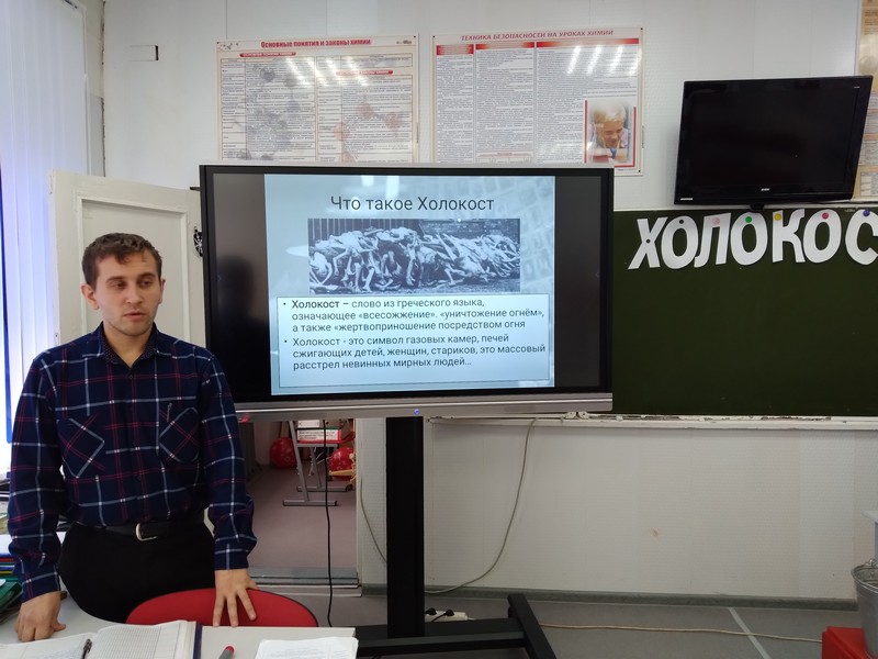 В фойе школы был оформлен стенд, содержащий информацию о жертвах Холокоста. Мероприятие было призвано познакомить учащихся с трагическими событиями уничтожения евреев нацистами и их союзниками в период с 1933 по 1945 год, в том числе и на оккупированной врагами территории СССР.