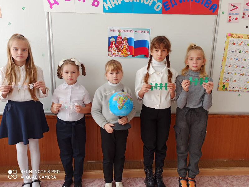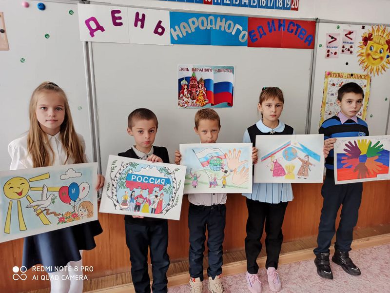 В дружбе народов – единство России! Учащиеся начальных классов приняли участие в мероприятиях, посвященных Дню народного единства. Все вместе вспомнили о народах, проживающих на территории РФ, прослушали гимн России, поговорили об истории этого праздника, нарисовали рисунки и изготовили поделки, спели песню «Я, ты, он, она – вместе дружная семья!»