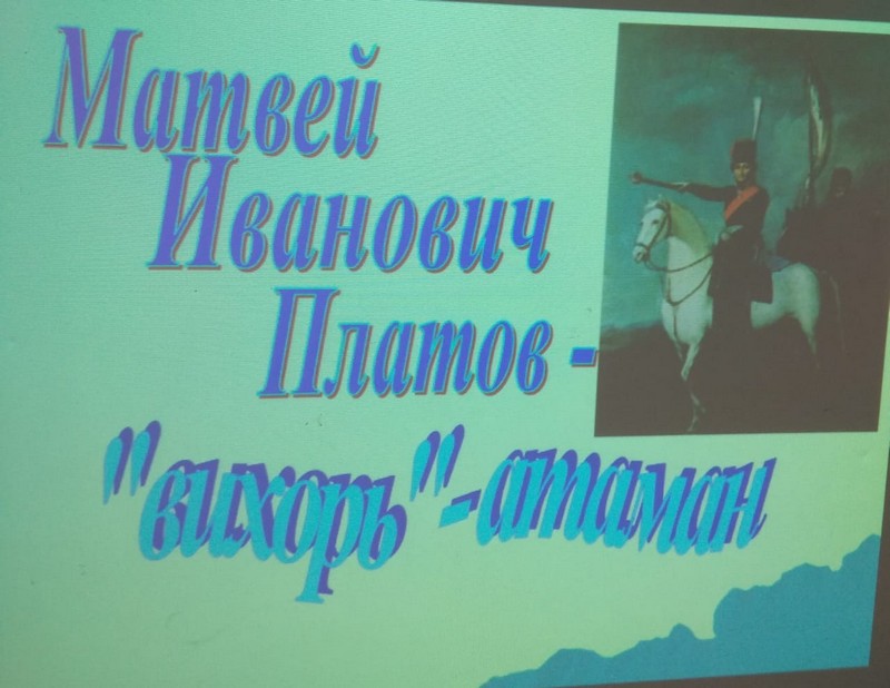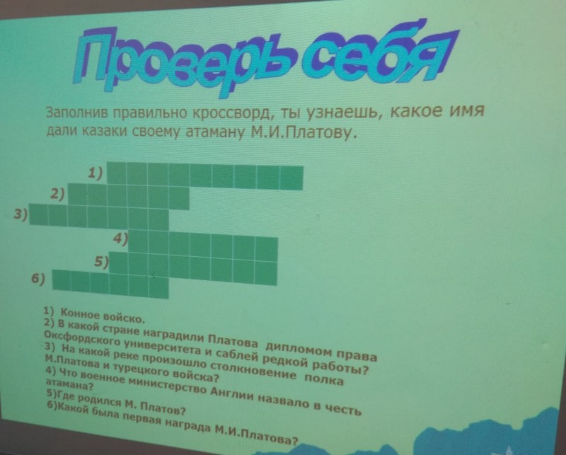 Целью этого урока было: создать целостный образ М.И.Платова как великого полководца; формировать чувство гордости за наших земляков, для которых «честь дороже жизни». В начале мероприятия ребята высказали свои мнения о том, что такое Родина, кто и как защищал нашу Родину, какими были русские воины, одержавшие победу над врагами во многих воинах. В ходе этого урока ребята узнали о донском казаке – атамане Матвее Ивановиче Платове. Детям рассказали о его детстве, военной службе и о его судьбе в целом. Ребята узнали, какие качества характера ему были присущи, чем отличился он за свою жизнь. Была представлена презентация «Матвей Иванович Платов – «вихорь»- атаман», на которой были представлены все награды Матвея Платова. В конце урока ребята разгадывали кроссворд, в котором узнали, какое имя дали казаки своему атаману М.И.Платову. Основные знания, которые получили учащиеся: Платов – казачий атаман, герой Отечественной войны 1812 года, М.И.Платов – основатель г.Новочеркасск.