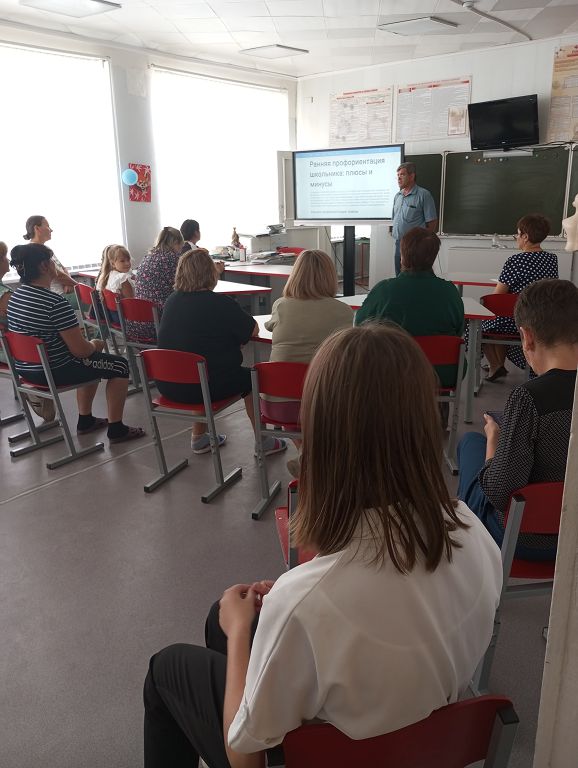 В школе 22 сентября прошел педагогический всеобуч по теме: «Помощь школьникам в самоопределении и профессиональной ориентации». По первому вопросу "Особенности профессиональной ориентации на различных этапах обучения." выступил учитель истории, ведущий профориентационного курса "Россия- новые горизонты" Шеваков Иван Алексеевич.