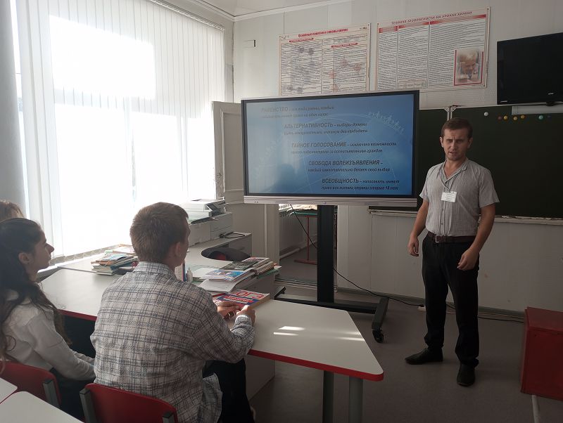 Советник директора по воспитанию и взаимодействию с детскими общественными объединениями Шеваков Андрей Иванович, являющийся председателем участковой избирательной комиссии 2335 рассказал школьникам, что выборы - это основной способ формирования органов власти, призванных служить обществу и интересам народа.