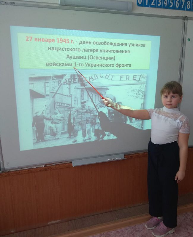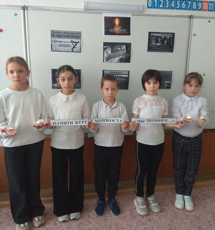 29 января в рамках Всероссийской Недели Памяти Жертв Холокоста учителя начальных классов провели в начальной школе урок памяти «Дети – жертвы Холокоста». Просмотрев презентацию, младшие школьники познакомились с некоторыми документами и фотоматериалами по истории Холокоста. Ребята узнали, что ежегодно 27 января по инициативе ООН отмечается Международный день памяти жертв Холокоста, что обозначает слово «Холокост». В конце мероприятия все присутствующие почтили память погибших минутой молчания.