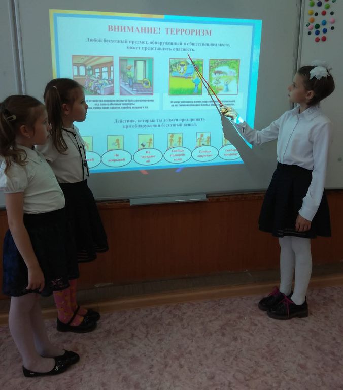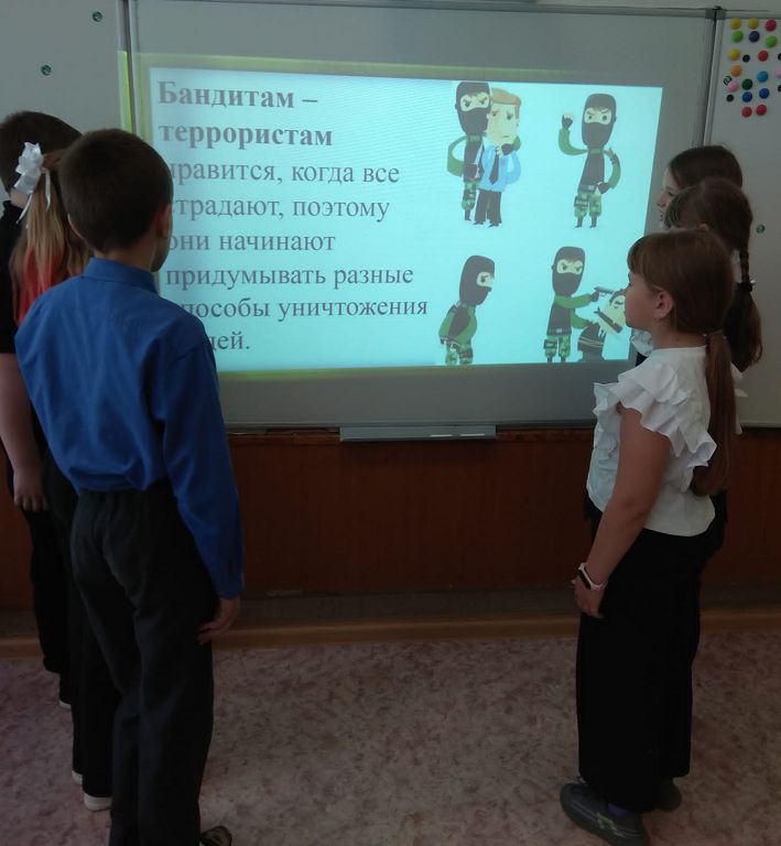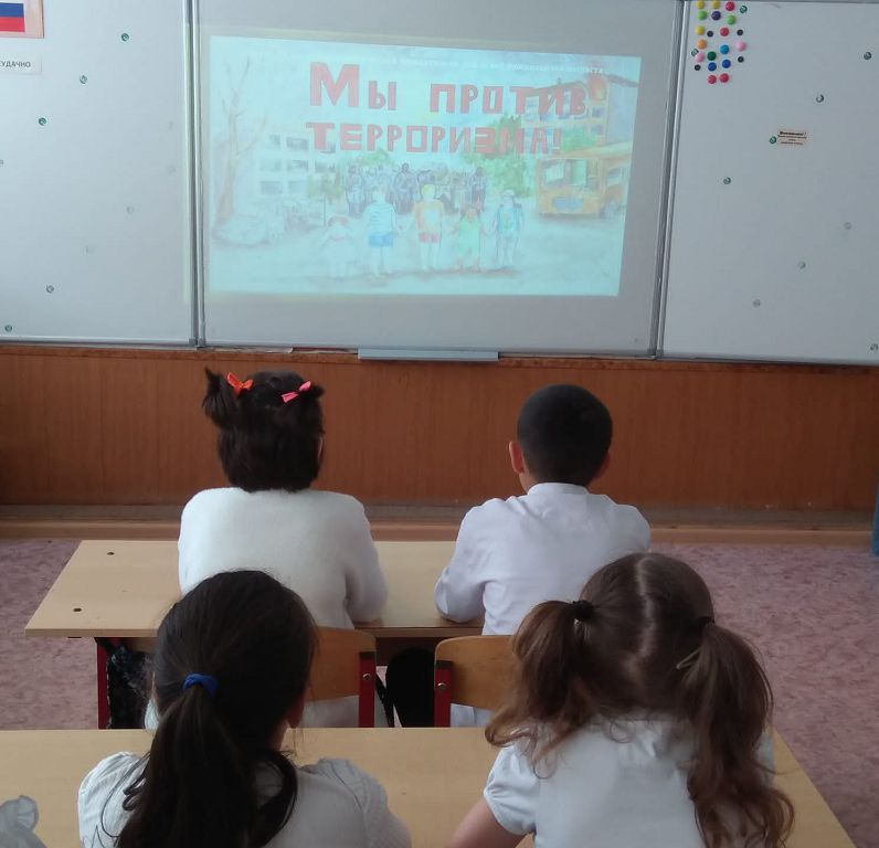 23 апреля в начальной школе был проведен классный час по теме профилактики экстремизма, терроризма, а также вовлечения несовершеннолетних в мошеннические действия. Ребята посмотрели презентацию «Мы против терроризма!», видеоролики и небольшие мультфильмы по данной теме. Младшие школьники узнали, кто такие террористы, как нужно себя вести в различных ситуациях.