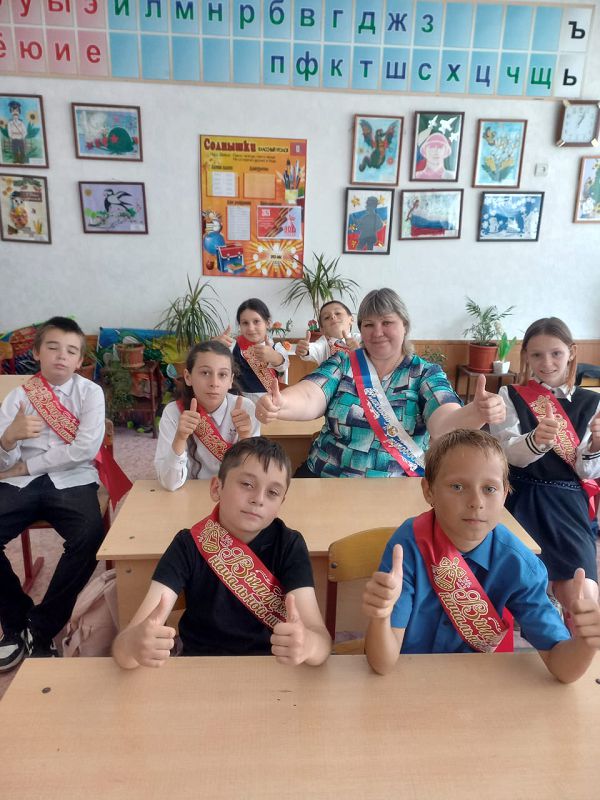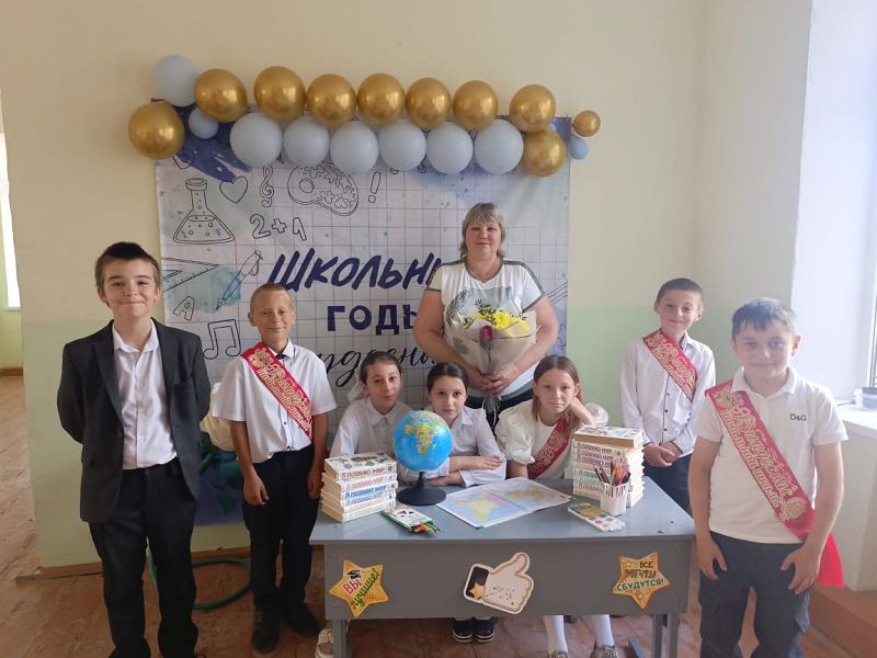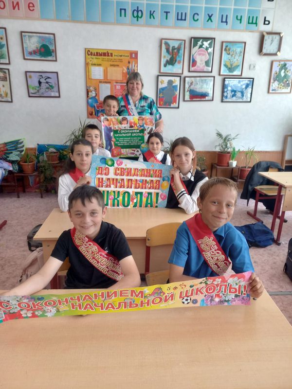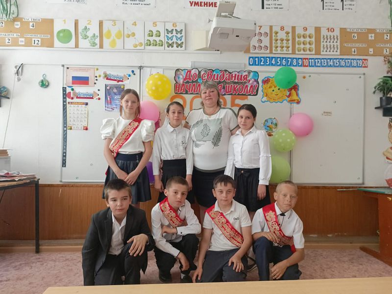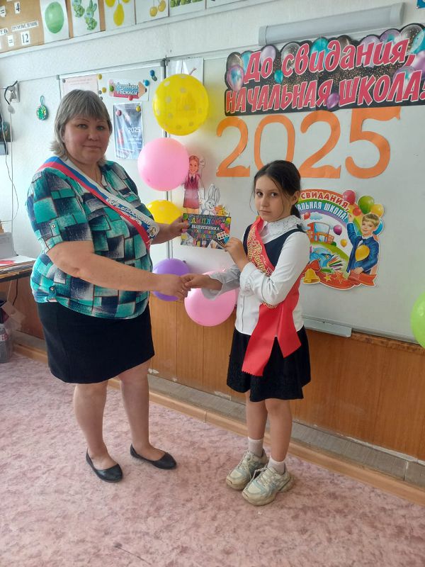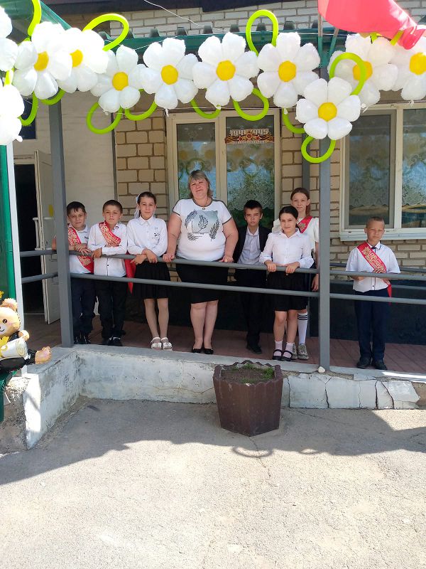 На выпускной были приглашены учителя, родители. В зале царила атмосфера радости и грусти одновременно. Радостно было, потому что выпускной — это праздник, и первая ступенька образования уже позади. А грустные нотки ощущались, поскольку это день прощания с начальной школой, со своим первым учителем Поповой Натальей Викторовной, с любимыми партами и классом.
