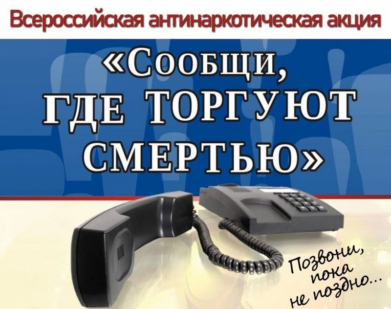 С 14 по 25 марта 2022 года на территории Ростовской области проводится первый этап Общероссийской акции «Сообщи, где торгуют смертью». Если Вы обладаете информацией о распространении, изготовлении, потреблении наркотических средств или психотропных веществ, либо полагаете, что совершается наркопреступление в сфере незаконного оборота наркотиков, сообщите об этом по телефону 8(863) 249-34-44 (ГУ МВД России по Ростовской области, звонок анонимный), 8(863) 972-11-32 (дежурная часть ОМВД России по Тацинскому району).