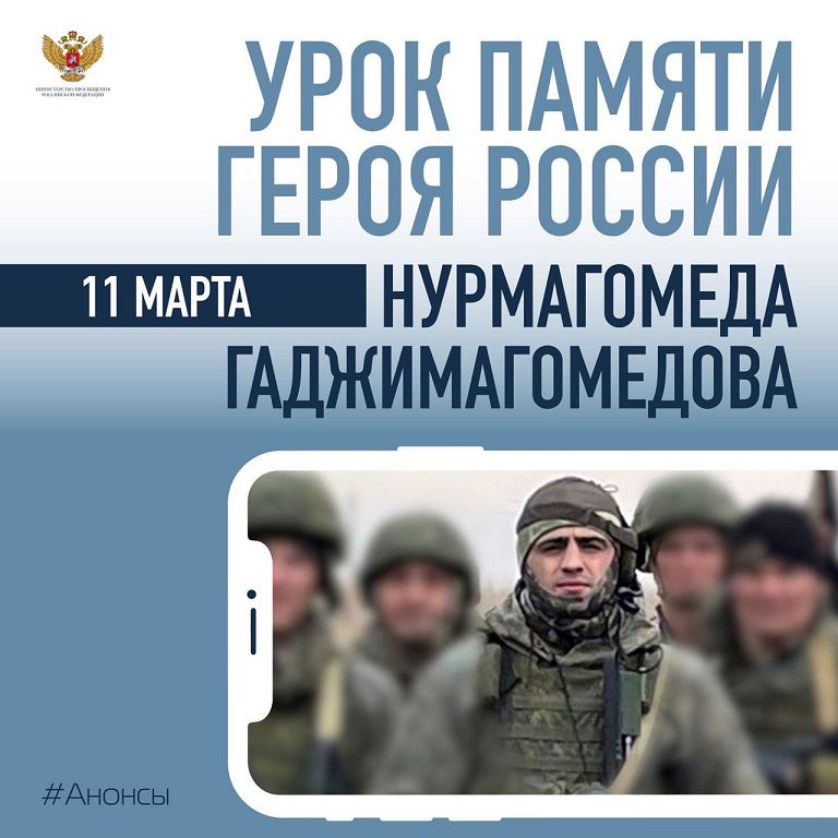 11 марта 2022 года в МБОУ Исаевской ООШ прошёл ВСЕРОССИЙСКИЙ УРОК ПАМЯТИ, посвящённый Дню памяти ГЕРОЯ РОССИИ ГАДЖИМАГОМЕДОВА НУРМАГОМЕДА ЭНГЕЛЬСОВИЧА – командира роты 247-го гвардейского десантно-штурмового Кавказского казачьего полка ВДВ России, удостоенного посмертно звания Героя Российской Федерации за «мужество и героизм, проявленные при исполнении воинского долга».