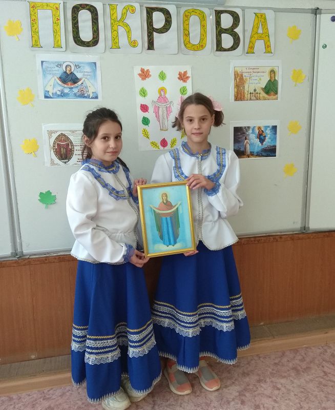 14 октября в начальных классах прошло замечательное мероприятие «Покров день – платок надень!», посвященное Покрову Пресвятой Богородицы. На мероприятии ребятам была рассказана сама история праздника, что он значил для русского народа, было рассказано о традициях и обрядах Покрова . С интересом и задором дети вспоминали приметы, присущие этому времени года, разгадывали загадки про осень и урожай. В конце мероприятия был проведен конкурс рисунков.